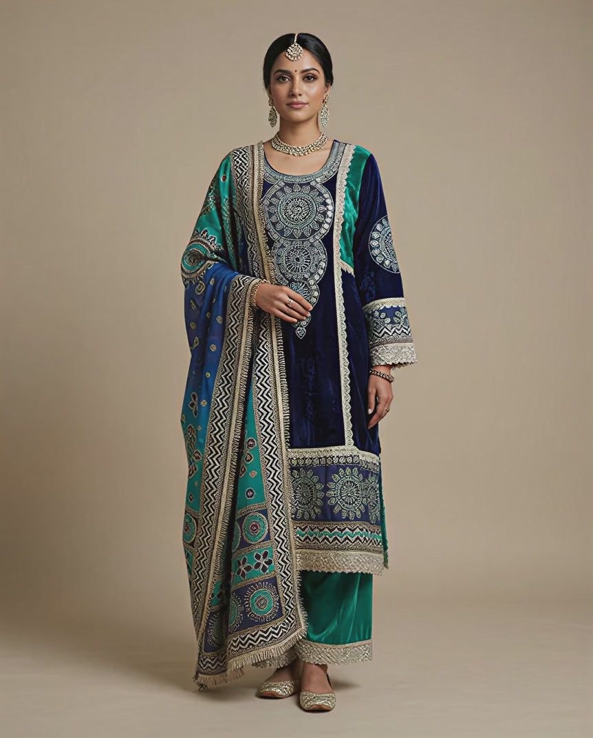 Elevate your festive and wedding wardrobe with this luxurious velvet palazzo suit, crafted to bring together royal charm and contemporary elegance. The deep navy blue velvet kurta features an opulent front panel adorned with intricate zari, thread, and sequin embroidery, forming beautiful circular and floral motifs that reflect timeless craftsmanship. The neckline is highlighted with exquisite embroidered detailing that adds a regal touch while enhancing the overall silhouette.